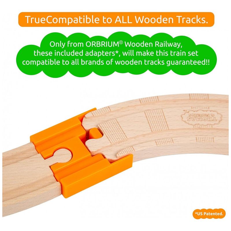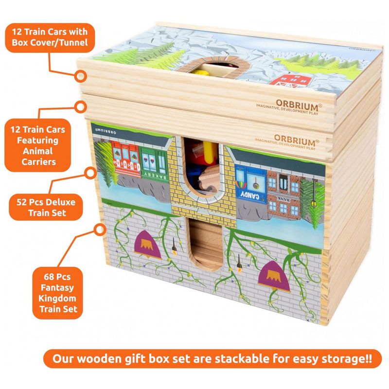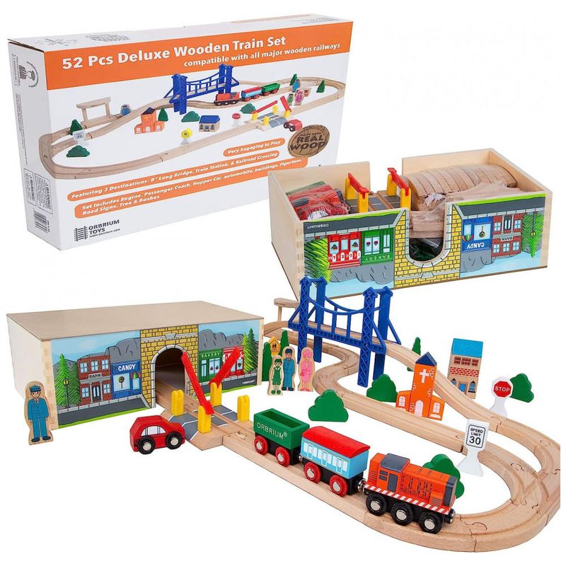 O conjunto completo de 52 peças inclui trilhos de madeira premium, motor, ônibus de passageiros, carro funil, automóvel, edifícios, estatuetas, sinais de trânsito, árvores e arbustos.