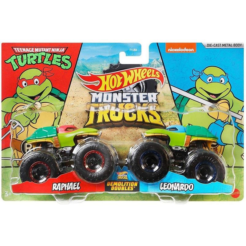 Conjunto de Veiculos - Hot Wheels - Monster Trucks - Raphael Vs Leonardo - Mattel: os veiculos Monster Truck Hot Wheels da colecao Demolition Doubles estao prontos para esmagar seus arquirrivais. Agora muito mais legais com este lancamento exclusivo inspirado na serie Tartarugas Ninjas. Estes sao os veiculos de Raphael e Leonardo estilizados como os herois de Teenage Mutant Ninja Turtles. Este kit com dois Monster Trucks podem se enfrentar em epicos ataques de colisao. Os veiculos Monster Raphael e Leonardo foram propositadamente desenvolvidos para batalhas mano-a-mano com suas rodas GIGANTES e design exclusivo em escala 1:64. Cada embalagem inclui dois oponentes e o pacote fornece estatisticas para cada um, incluindo nome, tipo de caminhao, forca e ataque de colisao exclusivo para uma grande diversao com Hot Wheels. • DETALHES: - Hot Wheels Monster Truck Tartarugas Ninjas: inspirado e Raphael e Leonardo - Rodas gigantes e detalhes incriveis - as criancas vao querer colecionar todos eles! - Cada Monster Truck na colecao inclui uma roda colecionavel! - Construido para esmagar e bater tudo a vista, esmagando qualquer carro no caminho INFORMACOES: • Produto: Monster Trucks Monster Raphael x Leonardo • Marca: Mattel • Colecao: Hot Wheels Monster Trucks • Serie: Teenage Mutant Ninja Turtles (Tartarugas Ninjas) • Linha: Demolition Doubles • Tipo: Veiculo Colecionavel • Categoria: Carrinhos e Cia • Escala: 1/64 • Conteudo: 2 veiculos • Recomendacao: para criancas a partir de 3 anos de idade ESPECIFICACOES: • Referencia: FYJ64 / GJF65 • Codigo de Barras: 0887961705430 • Embalagem (C x A x L): 16.5 x 14 x 06 cm • Embalagem (Peso): 0.260 kg • Material / Composicao: Metal e Plastico • Registro: CE-BRI/INNAC-00128-03A • Certificado: Orgaos Autorizados - OCP´S (Organismos de Certificacao de Produtos) BENEFICIOS DE BRINCAR: • Eleva a autoestima • Exercita a memoria • Estimula o raciocinio • Exercita o imaginario • Desenvolve a criatividade • Desenvolve percepcao visual • Desperta a atencao e curiosidade • Desenvolvimento neuropsicologico • Estimula habilidades motoras basicas • Incentiva a comunicacao e linguagem • Desenvolve aspectos emocionais e afetivo • Estimula o reconhecimento de formas e cores AVISO: • As imagens sao meramente ilustrativas • Os pesos, tamanhos e medidas sao aproximados • As cores e estampas dos produtos podem ter variacoes • As informacoes sao de responsabilidade do fabricante ou fornecedor
