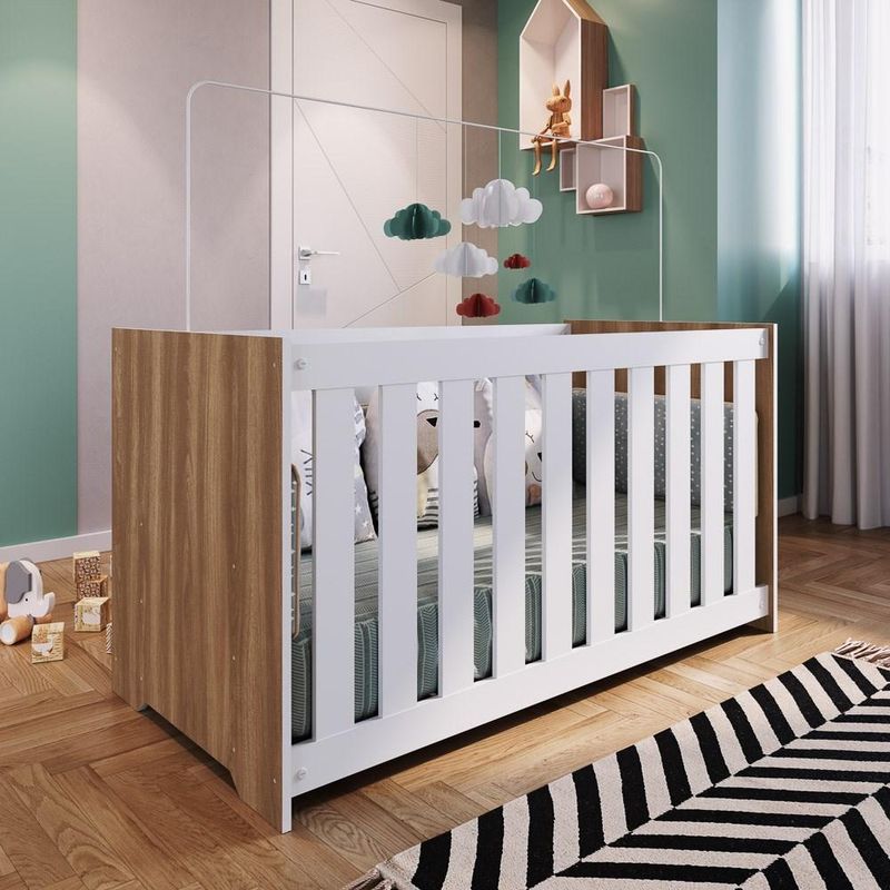 Para ter um quarto de bebê completo não precisa encher o espaço com muitos móveis, por isso, esse guarda roupa com ponte é uma ótima opção para quartos pequenos, pois além de ganhar espaço de organização aéreo e otimizar a circulação, você ainda pode encaixar o berço abaixo da ponte, tanto na horizontal, quanto vertical. Falando de berço, esse modelo conta com três regulagens de altura, acompanhando o desenvolvimento do bebê. Para completar, o colchão para berço possui densidade 18 para o máximo conforto, além de tripla proteção contra ácaros, mofos e alergias. Tudo para garantir um soninho tranquilo e seguro.