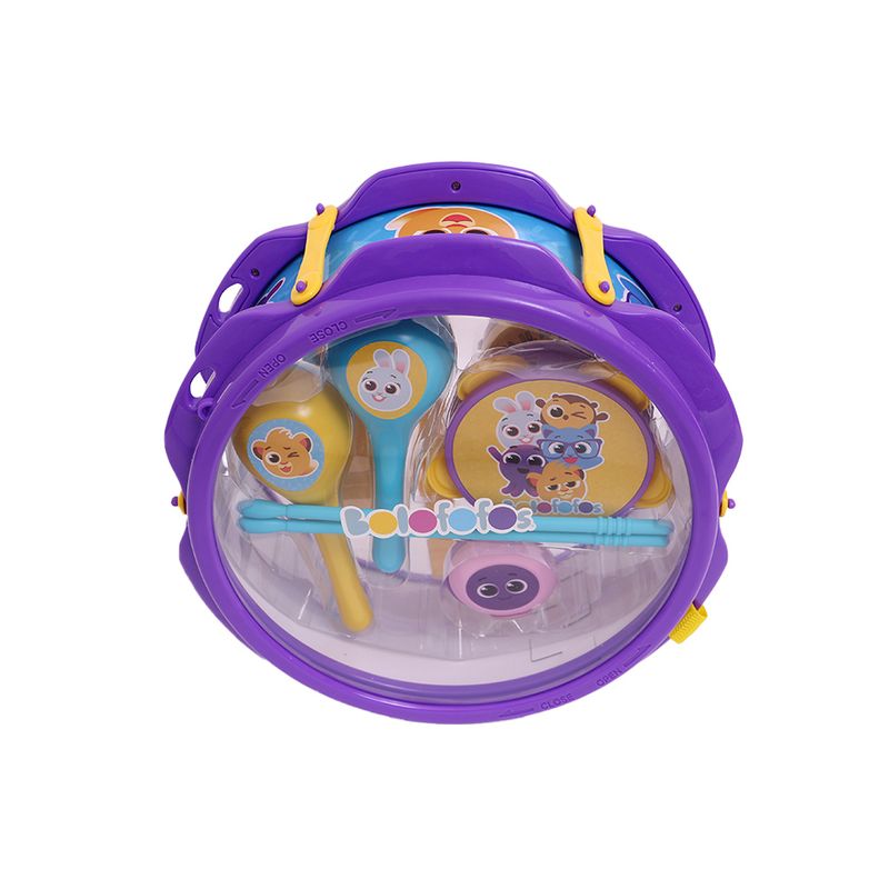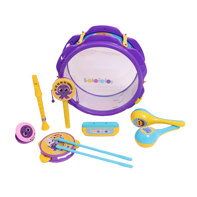 Bolofofos Kit Bandinha. É um conjunto com várias peças musicais para as crianças se divertirem e iniciarem no universo musical. Ele vem com 1 castanhola, 1 par de baquetas,1 tambor com alça, 1 pandeirinho, 1 kabuletê, 1 gaita e 1 flauta.