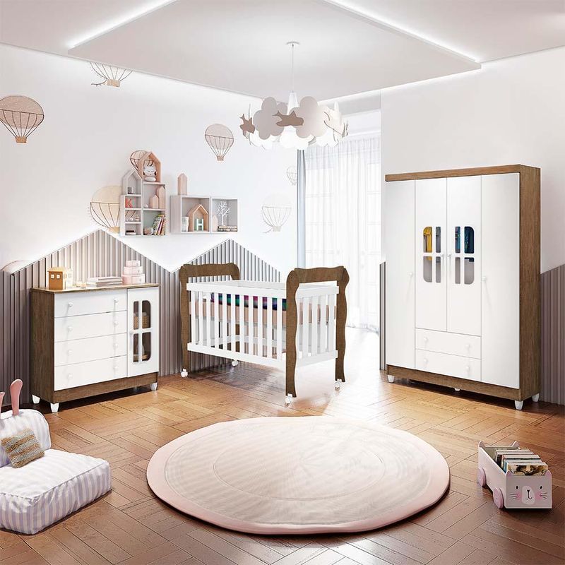 Para não ter dúvidas na hora de montar o quartinho do seu baby, a nossa linha de dormitórios já vem com três peças fundamentais e combinando entre si: nosso berço mini-cama + cômoda + roupeiro, que ainda conta com um kit anti-tombamento. O conjuntinho perfeito para você começar a decoração desse cantinho tão especial. Tudo feito com muito amor e segurança para que o seu filhote seja muito bem recebido em seu novo lar. Disponível nas cores Branco Brilho ou Branco Fosco com Amadeirado.
