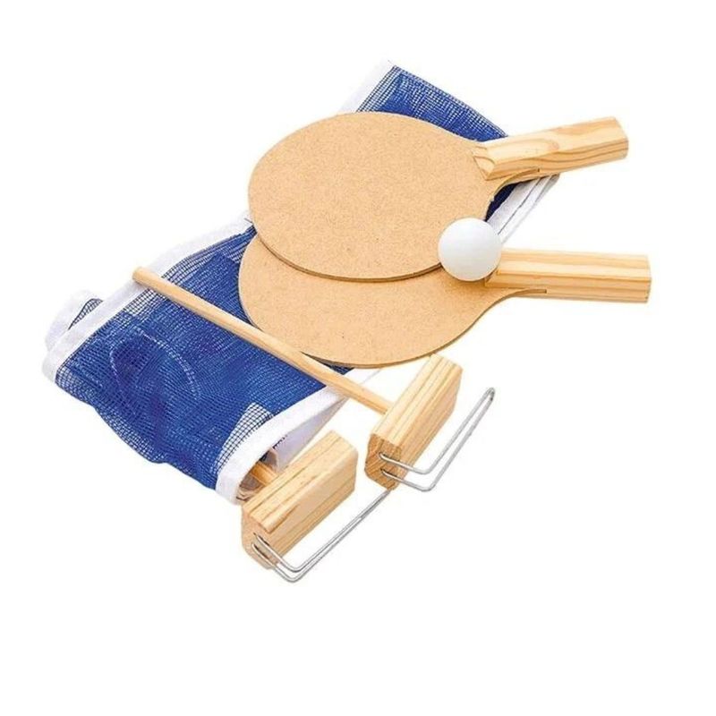 Contém 2 raquetes, 1 rede com suporte e 1 bolinha.