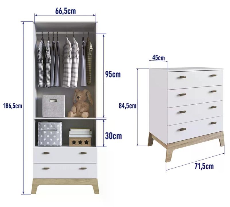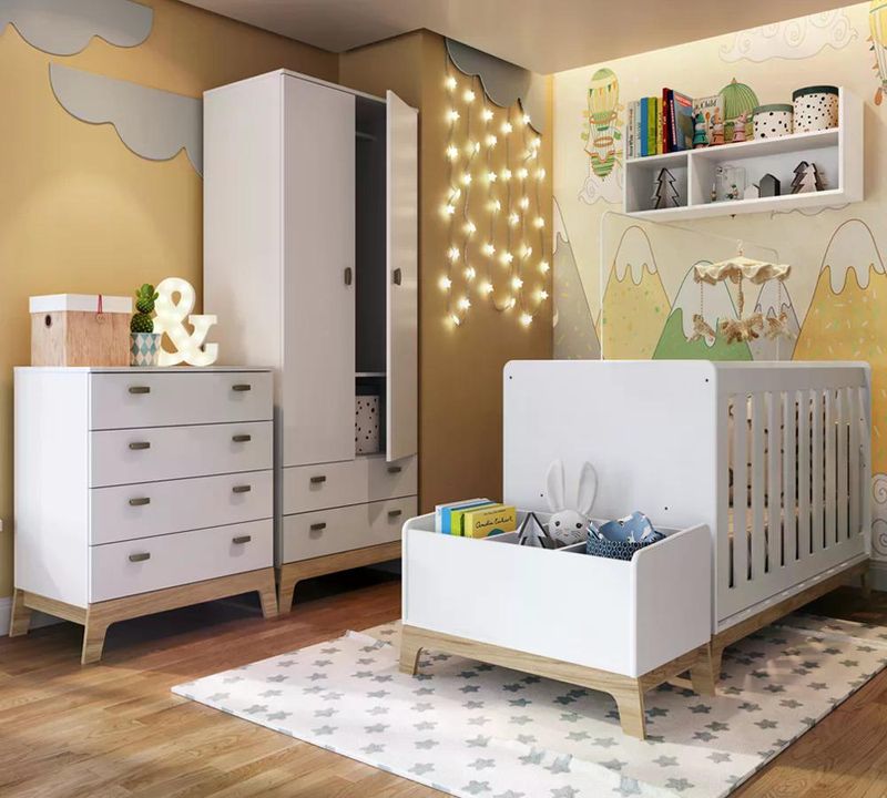 Quarto Infantil com Berço 3 em 1 + Colchão + Cômoda 04 Gavetas + Guarda Roupas + Nichos de Parede Livreiro + Caixa de Brinquedos Linha Favo de Mel. Possuem estrutura em MDP de 15mm, com acabamento em pintura BP (Fosco). Portas com dobradiças metálicas, gavetas com corrediças metálicas, puxadores modernos e requintados, amplo espaço interno com cabideiro e prateleira, Berço transforma-se em mini cama, suporte do estrado em madeira e os lastros do estrado são em MDF, possui três opções para regulagem de altura do colchão, as grades são fixas e de talas largas em MDF, acompanha suporte para mosqueteiro. Colchão antialérgico medindo 130x60 cm,densidade D18, tecido estampado em Poliéster na cor Azul, um lado do colchão é em Plavinil que inibe a penetração de líquidos na espuma, e ainda possui tratamento de higienização que impede a formação e colonização de ácaros, fungos e bactérias. A Caixa Para Brinquedos e o Nicho Livreiro irão garantir a organização e decoração do ambiente. Mais produtos da Linha Favo de Mel, você encontra em nosso site, podendo fazer a composição completa para o quartinho do bebê. Estes móveis chegarão em sua casa separados em 07 volumes.