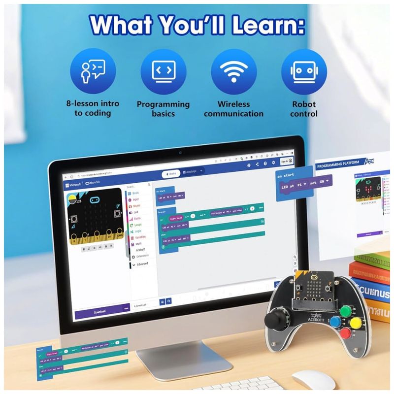 O ACEBOTT Wireless Controller para micro:bit é um controle educativo sem fio projetado para comandar robôs e projetos baseados em micro:bit, com design ergonômico atualizado, empunhadura mais espessa e bordas curvas que aumentam o conforto durante o uso contínuo. O controle reúne joystick, quatro botões responsivos e motor de vibração integrado, proporcionando resposta tátil em tempo real durante a execução dos programas e controle dos robôs. Este kit inclui a placa micro:bit e é compatível com a plataforma MakeCode, permitindo programação em blocos para criar comandos, ações e interações sem fio de forma progressiva para iniciantes.