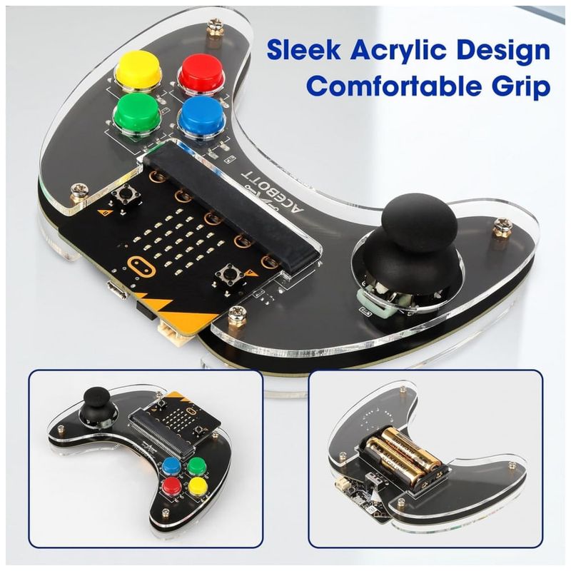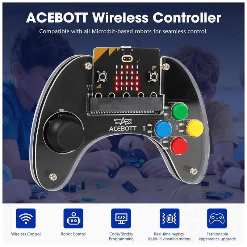 O ACEBOTT Wireless Controller para micro:bit é um controle educativo sem fio desenvolvido para comandar robôs baseados em micro:bit com ergonomia aprimorada, empunhadura mais espessa e bordas curvas para melhor conforto durante o uso prolongado. O controle integra joystick analógico, quatro botões responsivos e motor de vibração, oferecendo retorno tátil em tempo real para uma experiência mais imersiva de controle e programação. Ele é compatível com a plataforma MakeCode, permitindo criar programas em blocos para comunicação sem fio e mapeamento de comandos para robôs e projetos interativos com micro:bit.