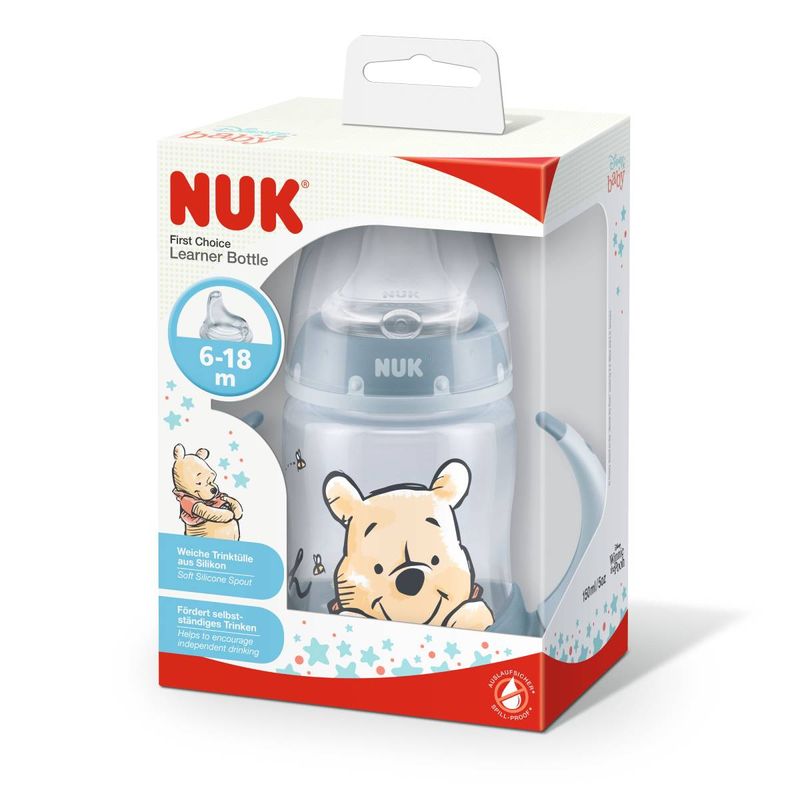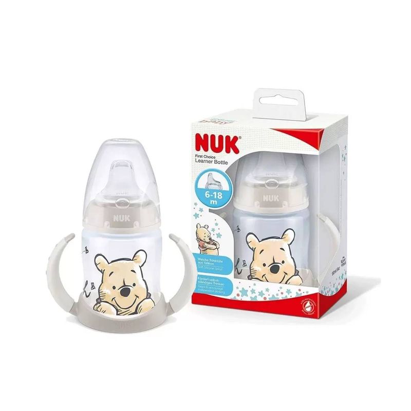 Copo Antivazamento Active Cup Disney Pooh 150ml Neutro - NUK O Copo de Treinamento NUK First Choice Disney Pooh com Controle de Temperatura 150ml possui junto ao marcador de graduação do frasco o novo indicador que ajuda os pais na tarefa de assegurar a temperatura adequada dos alimentos para o consumo seguro das crianças. Se o conteúdo estiver muito quente, acima de 37º, o indicador de temperatura ficará branco, aguarde o indicador voltar a cor azul para oferecer o copo. Suas alças antiderrapantes são adequadas para as mãozinhas das crianças. É totalmente desmontável o que facilita a limpeza. Seu bico de silicone antivazamento possui a válvula NUK Air System Anticólica que abre e fecha instantaneamente a cada sucção, reduzindo a ingestão de ar, minimiza a formação de bolhas e promove uma alimentação contínua. O copo é livre de BPA e compatível com toda a linha de produtos NUK First Choice. O MINISTÉRIO DA SAÚDE ADVERTE: A CRIANÇA QUE MAMA NO PEITO NÃO NECESSITA DE MAMADEIRA, BICO OU CHUPETA. O USO DE MAMADEIRA, BICO OU CHUPETA PREJUDICA O ALEITAMENTO MATERNO. Principais Características: