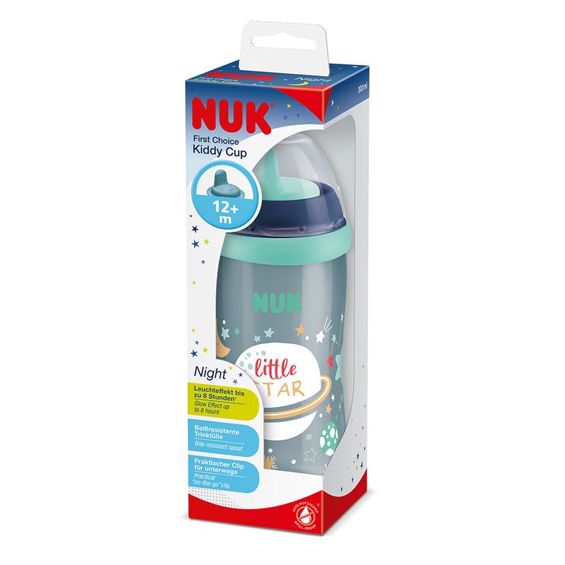 O Copo Antivazamento Kiddy Cup da NUK com efeito Brilha no Escuro pode ser encontrado rapidamente, sem precisar acender a luz durante a noite. O efeito de brilho dura até 8 horas por noite auxiliando as famílias durante a madrugada. Sua tecnologia "brilha no escuro" não é tóxica e não faz mal a saúde da criança. Para potencializar o efeito glow basta expor o copo à luz solar ou lâmpada para garantir maior tempo de brilho durante a noite. O bebedor do copo é antivazamento, rígido e resistente à mordidas sendo ideal para o momento em que os dentinhos dos bebês começam a nascer. Além de ter o tamanho ideal para acompanhar o pique dos pequenos, também é fácil de ser segurado pelas mãozinhas das crianças. O copo e seus componentes podem ser lavados na máquina de lavar louça. Seu frasco é transparente para acompanhar quantidade de líquido ingerida pela criança. O Kiddy Cup é compatível com todos os produtos da linha NUK First Choice.