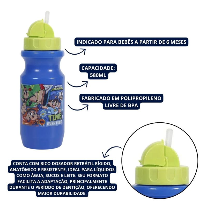Conta com bico dosador retrátil rígido, anatômico e resistente, ideal para líquidos como água, sucos e leite. Seu formato facilita a adaptação, principalmente durante o período de dentição, oferecendo maior durabilidade.