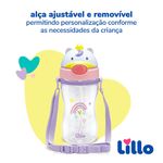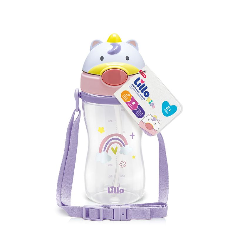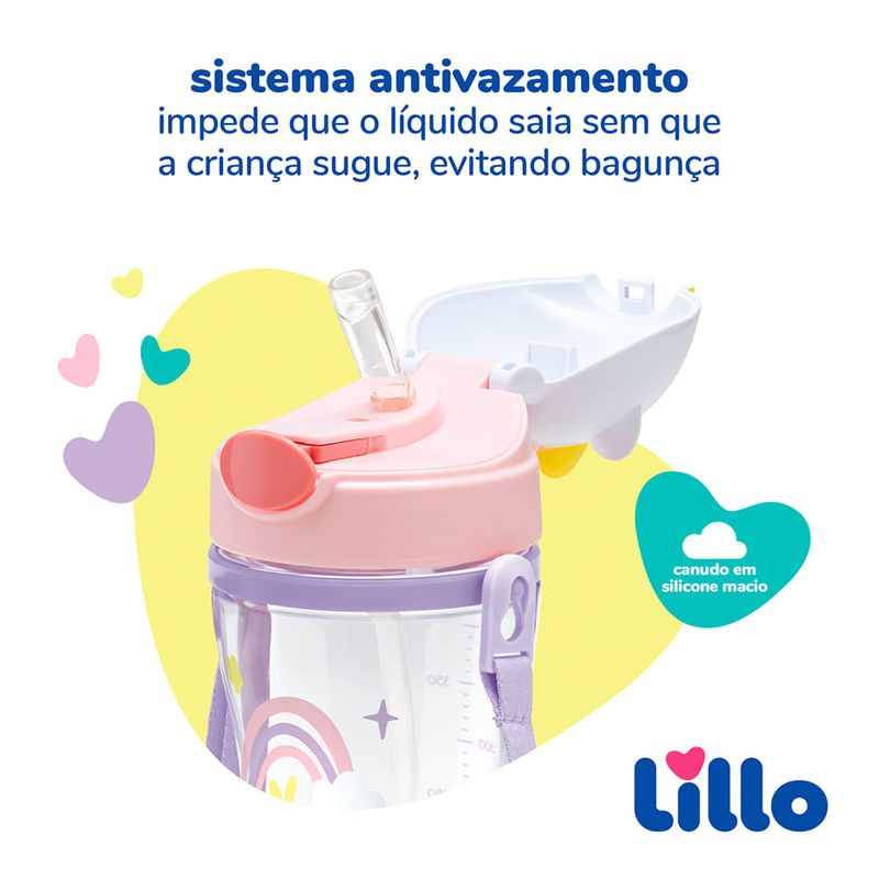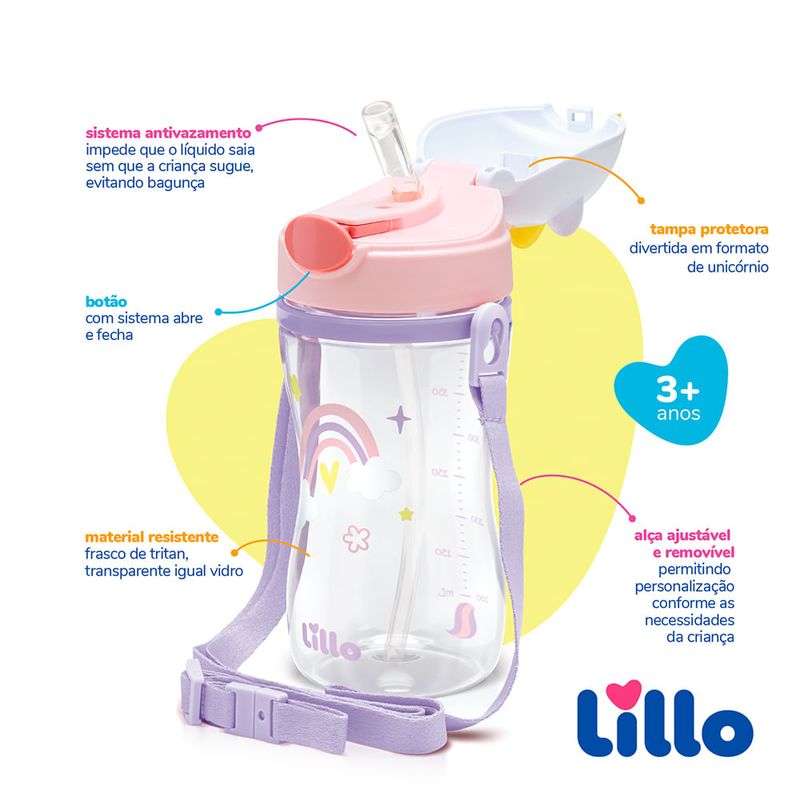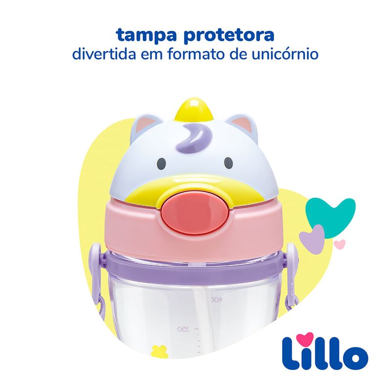 Copo Infantil Tritan com Alça e Canudo em Silicone Unicórnio 400ml - Lillo O Copo Infantil Tritan da Lillo foi especialmente desenvolvido para tornar o momento da hidratação uma experiência confortável e segura para as crianças. Com aparência de vidro, canudo em silicone e alça ajustável removível, ele é o companheiro perfeito para passeios e viagens! Cada copo possui uma tampa protetora lúdica e divertida em formato de animais, perfeitos para estimular a imaginação das crianças e explorar o mundo dos bichinhos. Ela pode ser facilmente aberta ou fechada com um simples toque no botão, mantendo o canudo protegido e limpo entre cada uso. O canudo é feito em silicone macio e flexível, com sistema antivazamento que impede que o líquido saia sem que a criança sugue, evitando bagunça. O frasco foi cuidadosamente desenvolvido com design ergonômico, lúdico, fácil de segurar e que se adapta perfeitamente às mãos pequenas das crianças. Produzido em material resistente, seu frasco é feito em tritan transparente igual ao vidro e é totalmente livre de BPA. Principais Características: