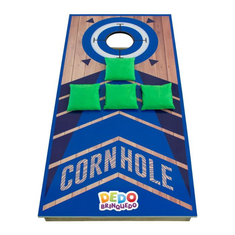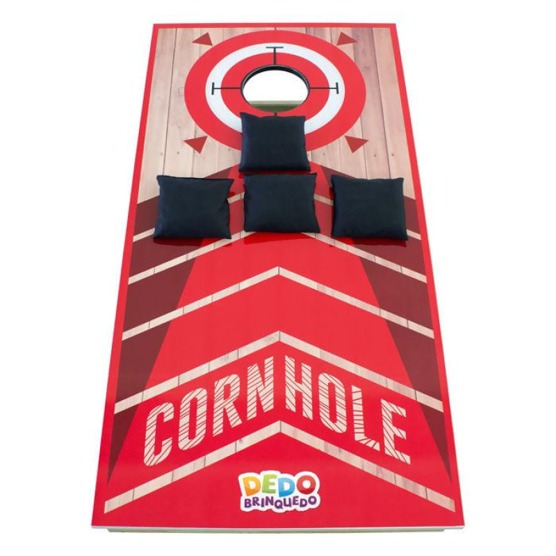 Cornhole - Acerte o alvo Super novidade na Dedobrinquedo! CORNHOLE é uma brincadeira de lançamento de sacos de milho, que se tornou um jogo com origem no Centro-Oeste e se tornando muito popular nos EUA especialmente em bares, universidades, áreas de lazer e residências. CORNHOLE é um jogo muito divertido, onde cada participante/jogador tem que lançar pequenos sacos de milho em uma plataforma de madeira que possui um buraco, o qual será o alvo. É um jogo de arremesso e pontaria, podendo ser jogado por duas ou mais pessoas, sempre em números pares, formando duas equipes ou mais, conforme o número de participantes/jogadores. A distância entre as plataformas poderá ser ajustada conforme a idade ou força e habilidade dos participantes/jogadores. Pontuação: - o vencedor será o participante/jogador ou equipe que atingir 21 pontos. - cada saco que entrar ou cair no buraco valem 3 pontos. - cada saco que ficar sobre a plataforma vale 1 ponto. Obs.: Saco fora da plataforma não pontua. Um saco adversário poderá derrubar da plataforma um saco do participante/jogador oponente, saco que sair da plataforma não pontua. Caso o saco do adversário derrubar no buraco o saco do participante/jogador oponente, este contará 3 pontos. Componentes do CORNHOLE: - cada jogo contém 2 placas de CORNHOLE de tamanho regulamentadas e 8 sacos de milho sendo, 4 de uma cor 4 de outra cor. - as placas são construídas com armações em madeira qualificada e apresentam duas vigas longitudinais e transversais para sustentação, sendo a superfície do jogo em madeira compensada. - as pernas das placas são articuladas com parafusos e deverão ser dobradas para baixo para armazenamento e transporte. - os sacos medem 6 ? x 6 ? = 15 cm x 15 cm de pano e preenchido com 1 libra = 15,5 onças = 0,43 kg de milho. - a cor base para cada participante/jogador pode variar da imagem exibida em alguns produtos. Este delicioso jogo está ganhando seguidores em todo o Brasil. Venha conhecer e descobrir a diversão do momento: o CORNHOLE.