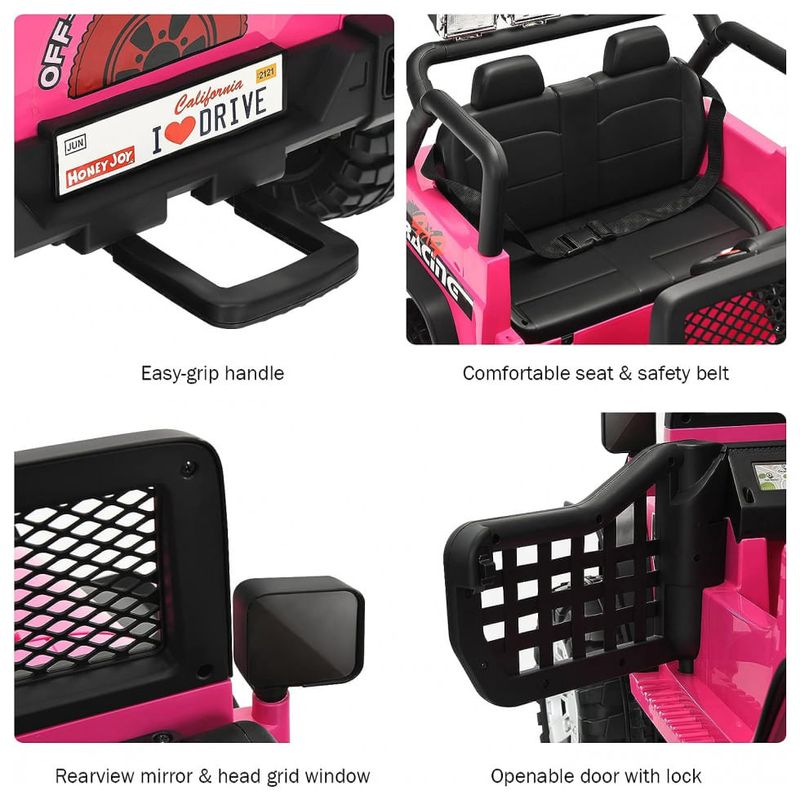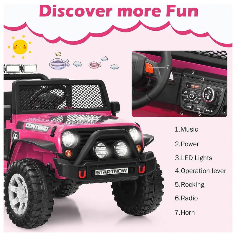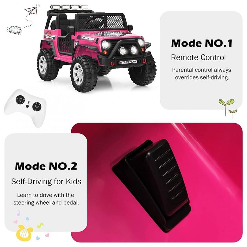 Um passeio e suave este caminhão de passeio de 12V possui suspensão de mola dianteira e traseira e uma função de partida lenta para garantir um tempo de reprodução em quase todos os terrenos. Sempre coloque seus filhos no cinto de segurança quando eles entrarem no carro e o amplo assento garante que o passeio seja confortável e alegre.