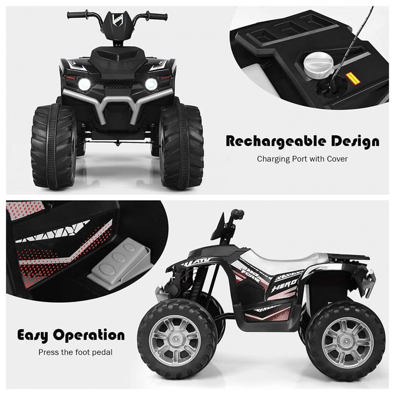 Rodas resistentes ao desgaste para tração todo o terreno equipado com rodas resistentes ao desgaste, o ATV com roda motriz permite que seus filhos andem em quase todos os terrenos, como praia, pista de borracha, estrada de cimento e muito mais. Tanto no interior como no exterior, os seus filhos podem divertir se onde quiserem. Além disso, 4 rodas de grande diâmetro devem apoiar seus bebês com grande estabilidade