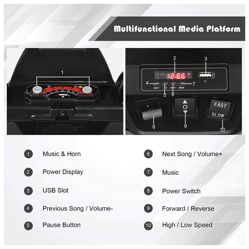Cheering Music Story for Infinite Fun O ATV elétrico alimentado por bateria de design recarregável dá a seus filhos a capacidade de dirigir por muito tempo após uma carga completa. O display de energia lembra você de carregá lo a tempo. E são várias músicas e histórias, pensadas para animar os seus filhos para que não se sintam entediados. A função de slot USB disponibiliza mais recursos.