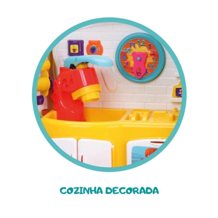 A cozinha tem botãozinho que faz barulho de crec crec, portinhas que abrem e fecham de verdade.