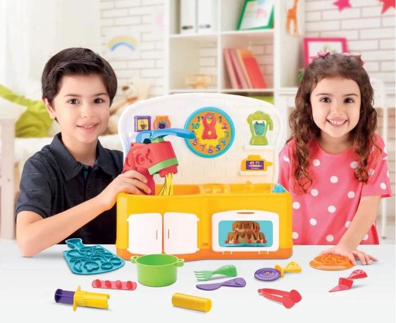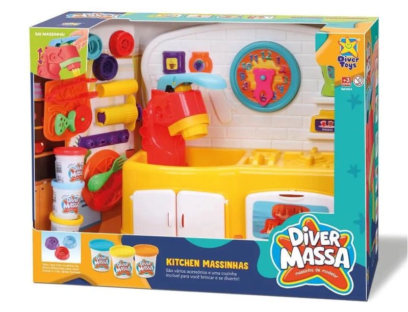 A Kitchen Massinha da Divertoys é uma super cozinha que vem com torneira que ao invés de sair água, sai massinha de modelar. São 3 bocais diferentes para a criança ter massinha em vários formatos.