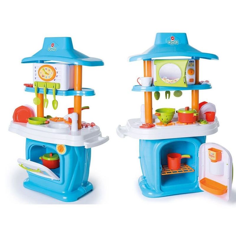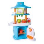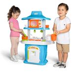 Cozinha completa com dois lados para brincar! De um lado uma geladeira com dispenser de água na porta que funciona de verdade, fogão e um forno de microondas com som! Do outro, um forninho e uma pia que vem com uma torneira que sai água! Nela dá para lavar os pratinhos, talheres, copos e panelinhas que vem junto com a Le Grand Chef!