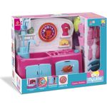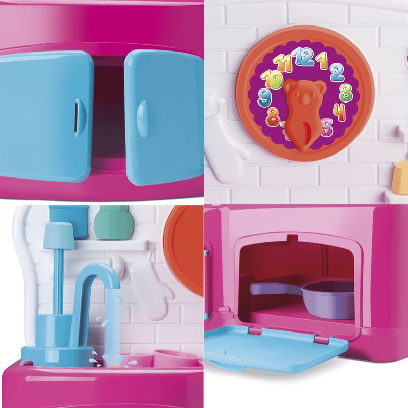 Agora suas bonecas My little collection vão poder cozinhar as comidinhas que quiserem. Essa super cozinha possui diversos acessórios e ainda solta água de verdade!!! O botãozinho faz crec-crec, as portinhas abrem, movimente o ponteiro do relógio e muito mais.