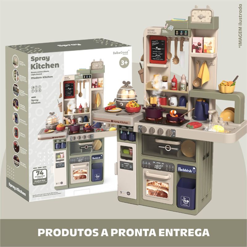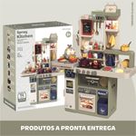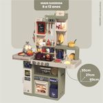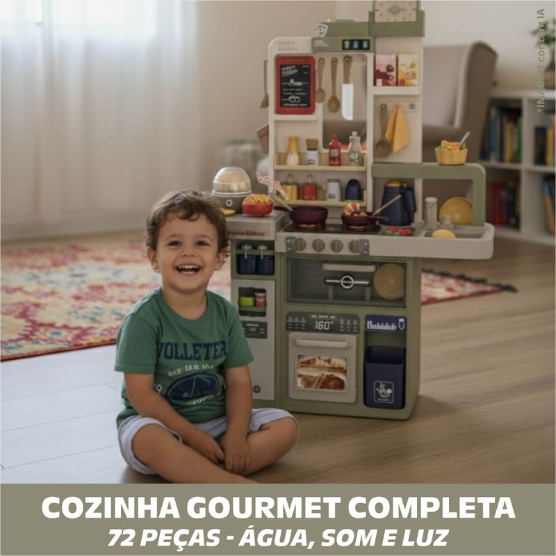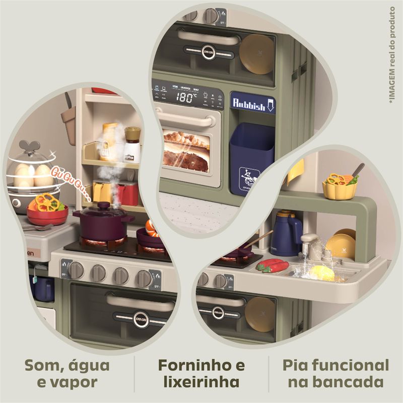 COZINHA GOURMET COMPLETA COM 72 PEÇAS – ÁGUA, SOM E LUZ Uma verdadeira experiência de faz de conta! Essa cozinha gourmet é super completa e cheia de detalhes realistas que deixam a brincadeira muito mais divertida. Com 72 peças variadas e diversas estações, ela estimula a imaginação, o aprendizado lúdico e a socialização. Pia com água de verdade, fogão com vapor, luz, som, forno, mercadinho, prateleiras e acessórios fazem dessa cozinha uma experiência única e envolvente. --------------------------------------------------- ESPECIFICAÇÕES TÉCNICAS