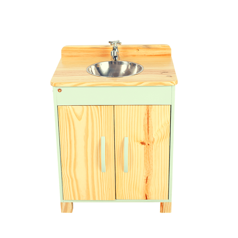 A pia infantil é feita de MDF e madeira de pinus, com pintura atóxica. Possui duas portinhas, possibilitando que a criança guarde objetos em seu interior.. Preservamos a cor natural da madeira em suas portinhas, sendo essa uma das características do método montessoriano: neutralidade e leveza no espaço do brincar.