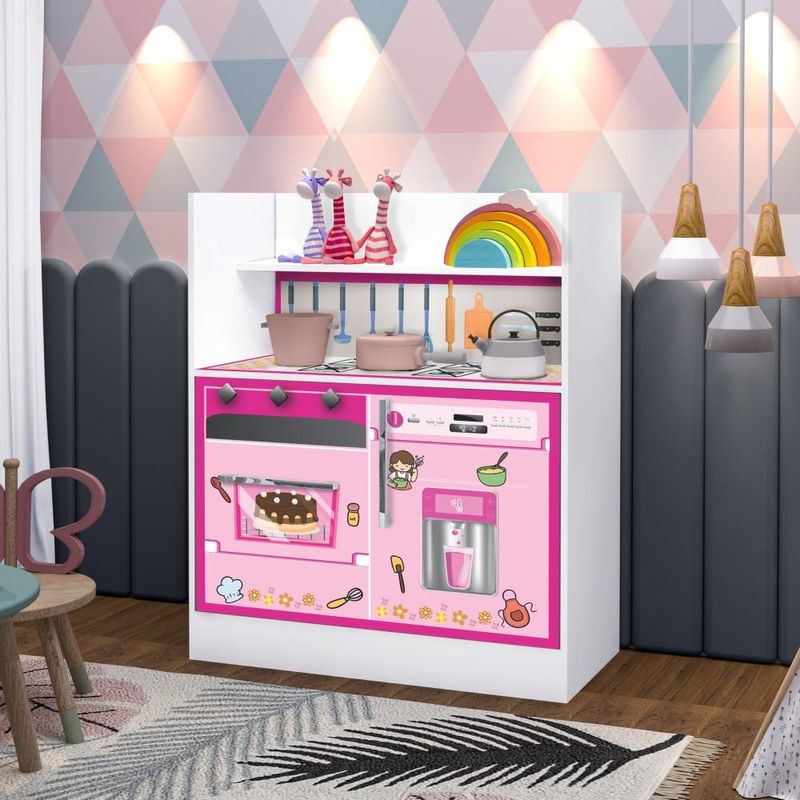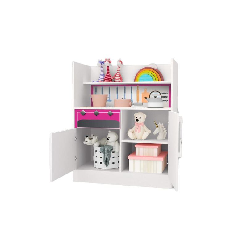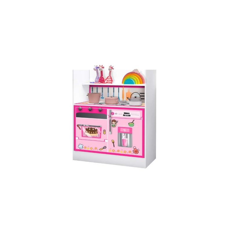 Produto em MDF/MDP – Porta brinquedos em forma de Cozinha Infantil. Possui 2 portas e 1 gaveta, além de 1 prateleira para melhor organizar os brinquedos de seus pequenos. Com pintura em UV semi brilho, é um produto pratico e decorativo. Utilizar pano seco na limpeza.