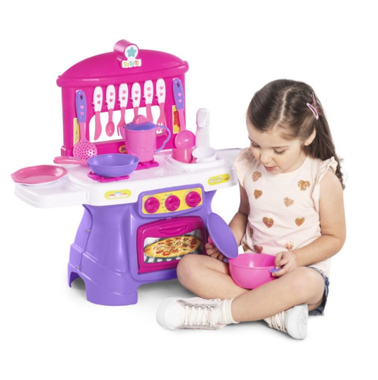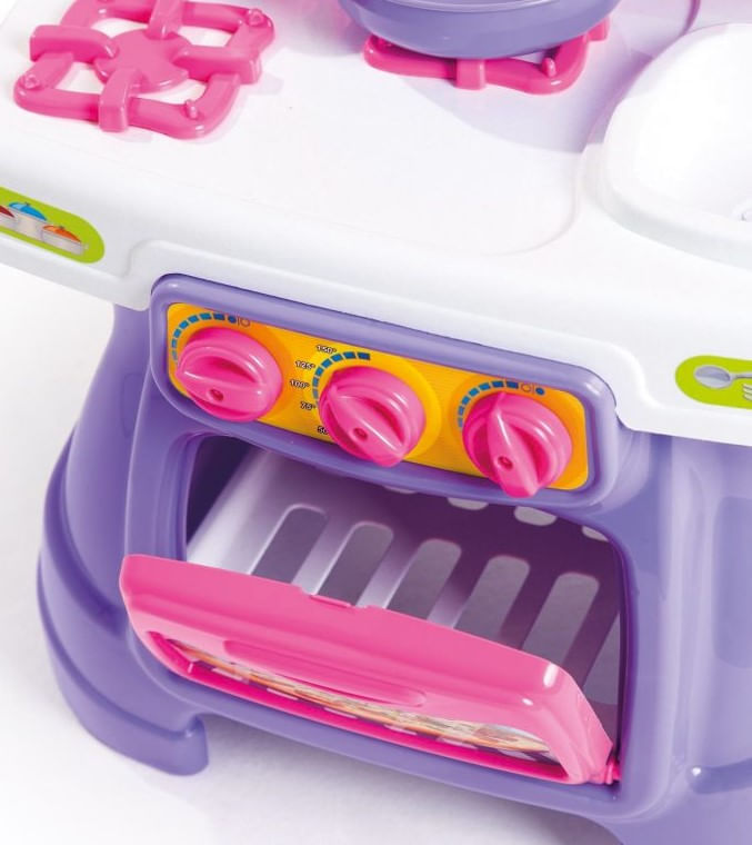 A mini chef tem forninho e pia que sai água de verdade para tornar a brincadeira mais realista e a pequena chef fazer comidinha igual a mamãe!