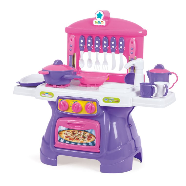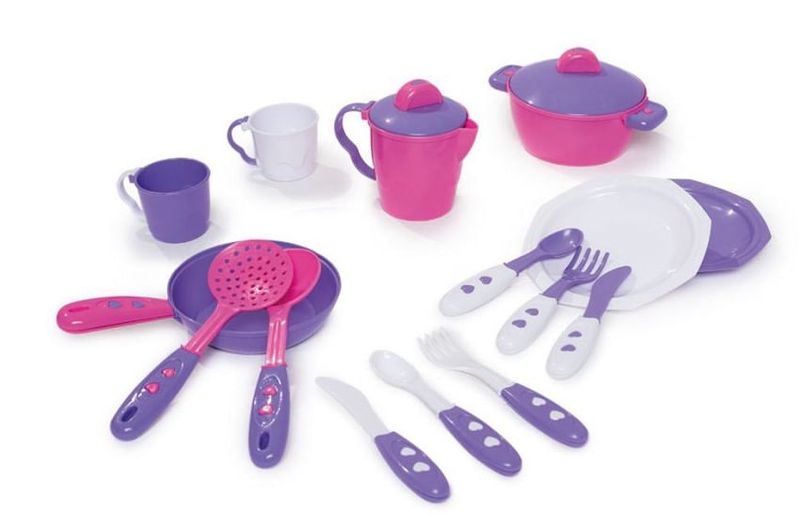 Conteúdo da Embalagem: 1 cozinha, 2 panelinhas, 2 pratos, 2 copos, 2 facas, 2 garfos, 2 colheres, 1 espátula e 1 concha.
