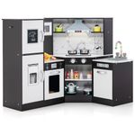 Este conjunto de cozinha de canto inclui um lavatório separado para maior comodidade. A torneira giratória e a pia removível permitem que as crianças finjam lavar legumes, enquanto a torneira emite sons divertidos e luzes. O forno micro ondas, o exaustor e os fogões duplos com vapor possuem efeitos sonoros realistas e luzes.