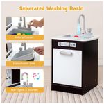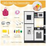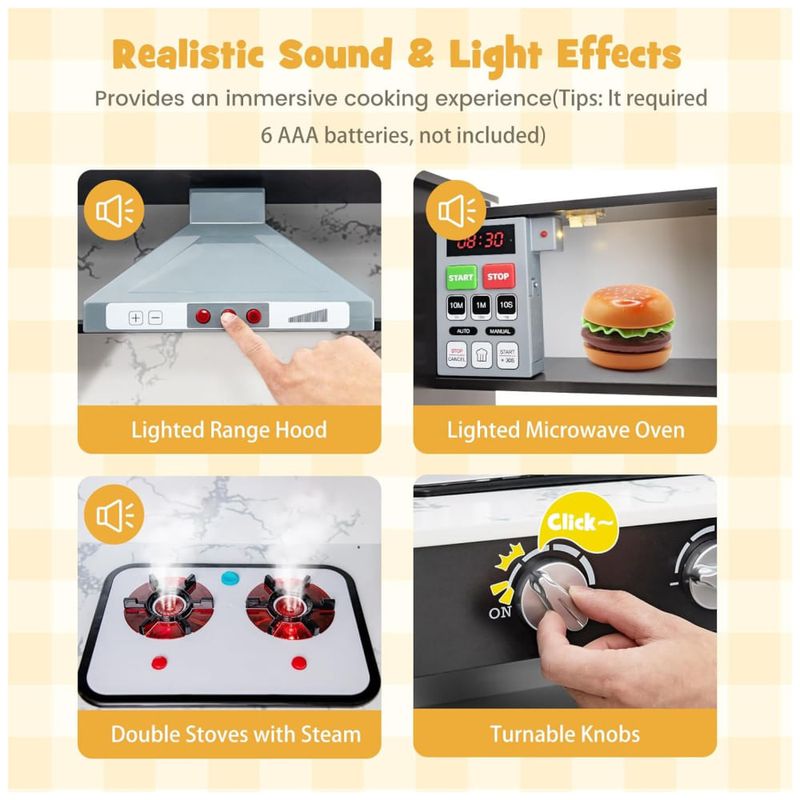 Os botões giratórios também emitem sons quando movidos, tornando a experiência mais realista. A máquina de fazer gelo é capaz de produzir cubos de gelo reais e a máquina de lavar louça simulada permite que as crianças finjam assar e limpar pratos. Há uma prateleira superior e duas prateleiras abertas para armazenamento de alimentos para brincar, além de três ganchos para utensílios. O conjunto de cozinha também possui um quadro negro para desenho e escrita.
