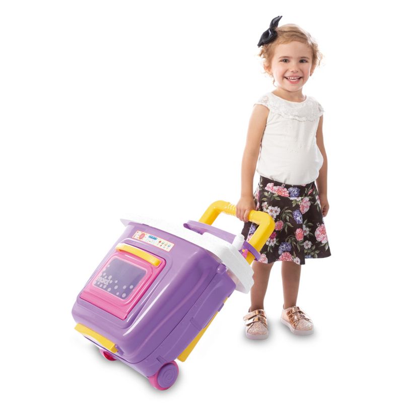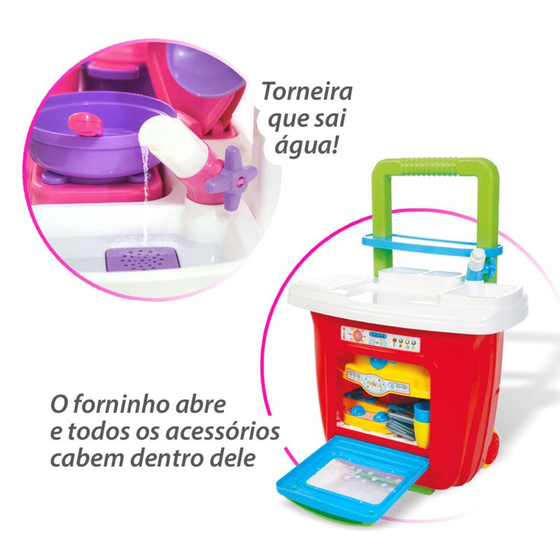 Este modelo portátil possui alça retrátil e rodinhas, facilitando o transporte. A torneira funcional permite que a criança brinque com água de verdade, e o forninho com porta que abre adiciona realismo à brincadeira. Acompanha 16 acessórios, incluindo panelinhas, talheres e copos, para uma diversão completa.