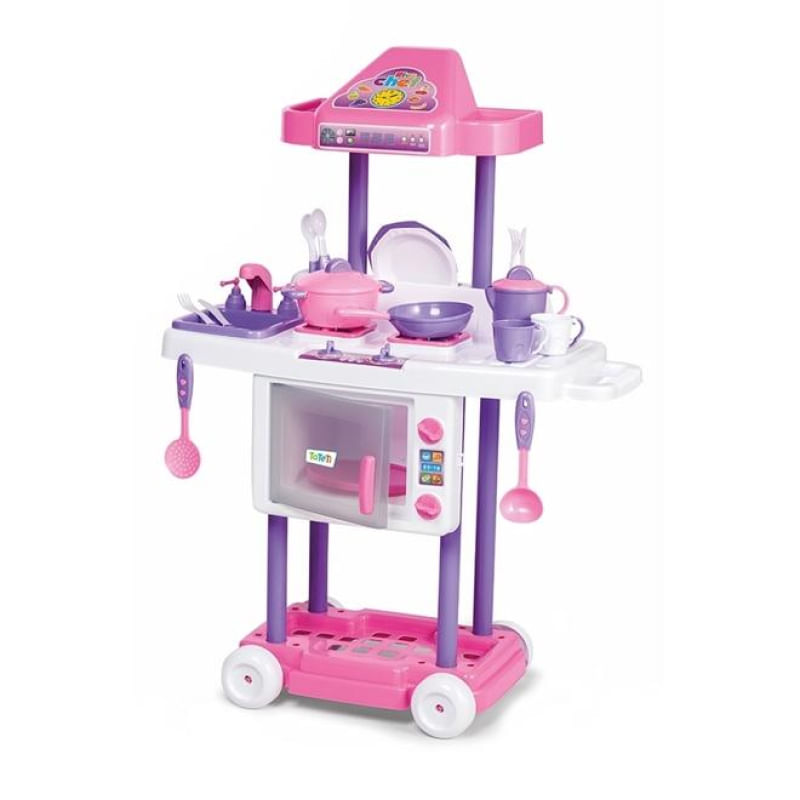 A cozinha ainda tem rodinhas para levar a brincadeira para todos os lados!