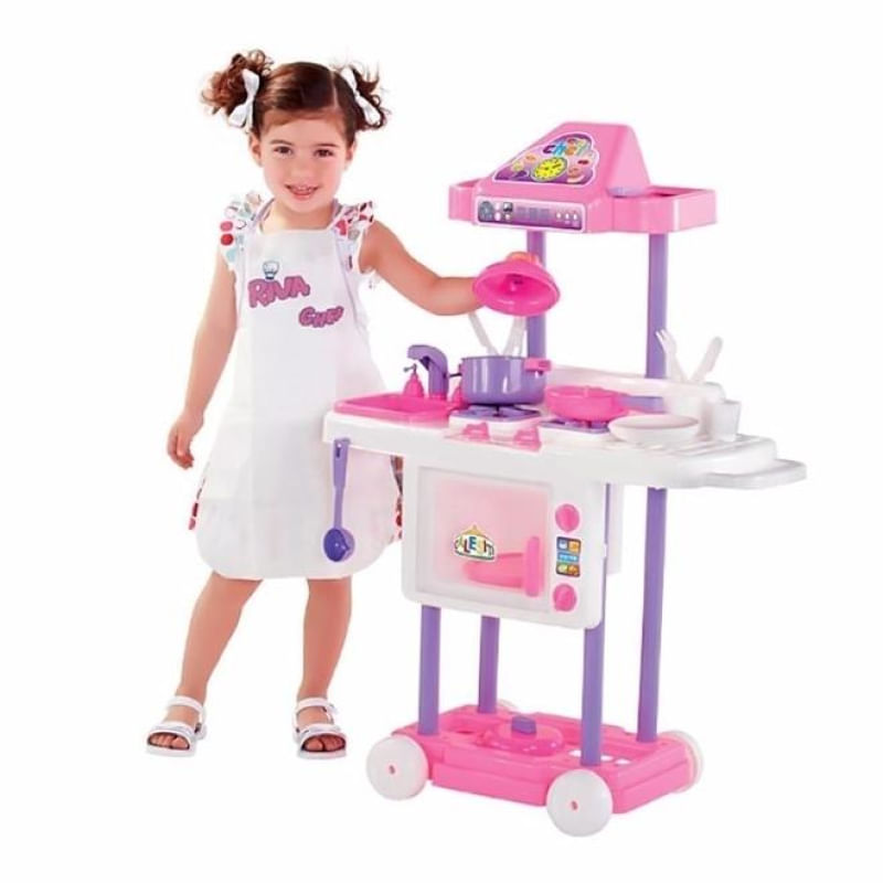 Contém: 1 cozinha riva chef, 2 panelinhas, 2 pratos, 2 copos, 2 facas, 2 garfos, 2 colheres, 1 concha e 1 espátula.