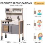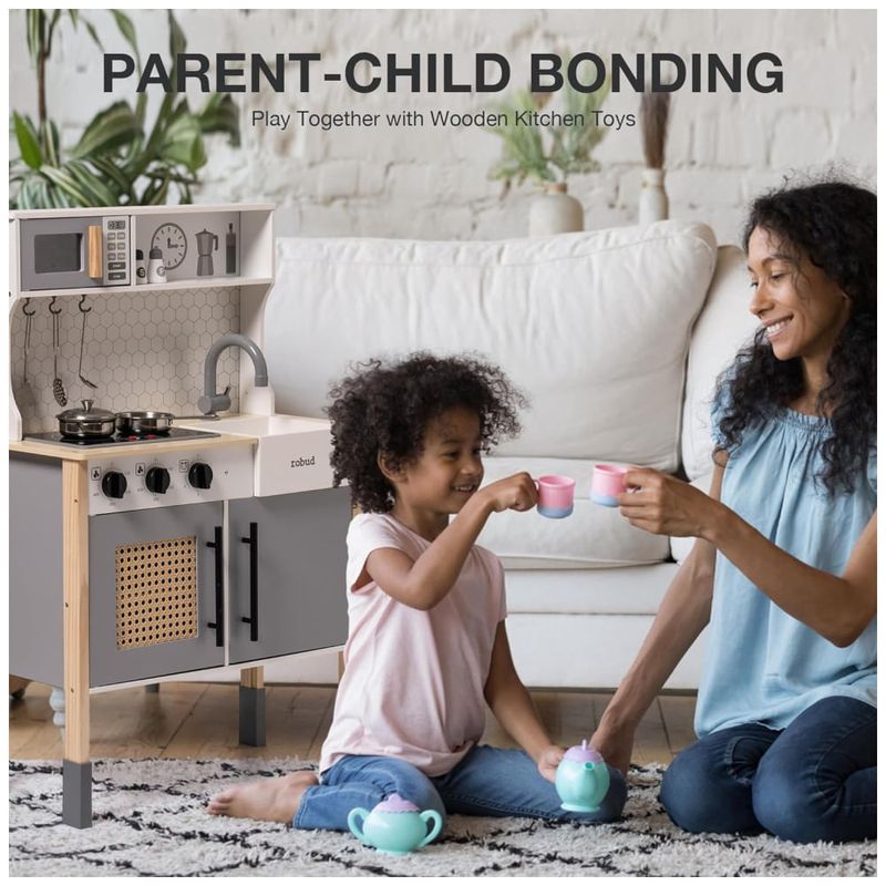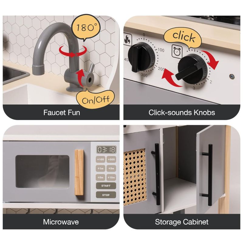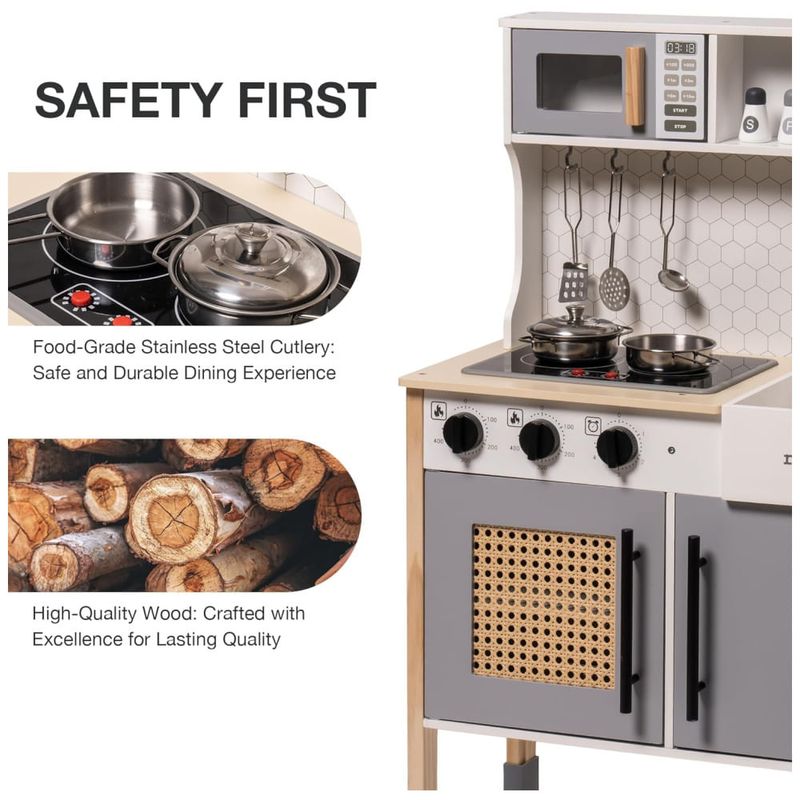 A cozinha lúdica ROBUD é um conjunto de cozinha infantil feito de madeira ecológica premium e tinta não tóxica, garantindo um ambiente seguro e saudável para as crianças brincarem. Com um design elegante de inspiração vintage americana, este conjunto de cozinha infantil se destaca com seus detalhes em gabinete de vime e elegante cor cinza, que pode melhorar a decoração da sua casa.