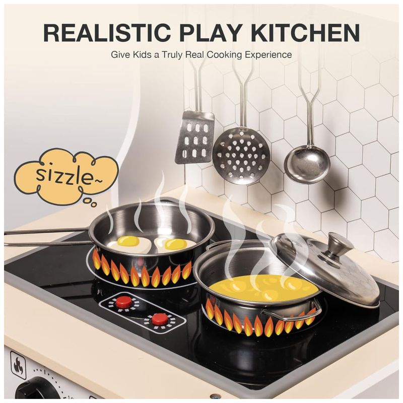 Todos os acessórios desta cozinha lúdica produzem sons autênticos, permitindo que as crianças mergulhem em uma configuração de cozinha realista e aumentem a diversão do jogo. Durante a dramatização em jogos de cozinha, as crianças podem estimular sua criatividade e imaginação, permitindo que elas expressem livremente suas ideias e preferências, ajudando as a desenvolver confiança e autoconsciência.
