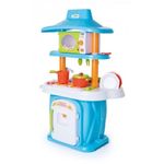 De um lado uma geladeira com dispenser de água na porta que funciona de verdade, fogão e um forno de microondas que faz barulho igual ao da mamãe! Do outro, um forninho e uma pia que vem com uma torneira que sai água! Nela dá para lavar os pratinhos, talheres, copos e panelinhas que vem junto com a Le Grand Chef!