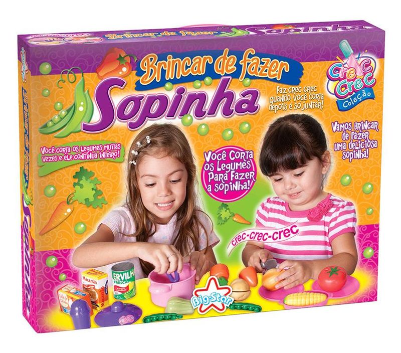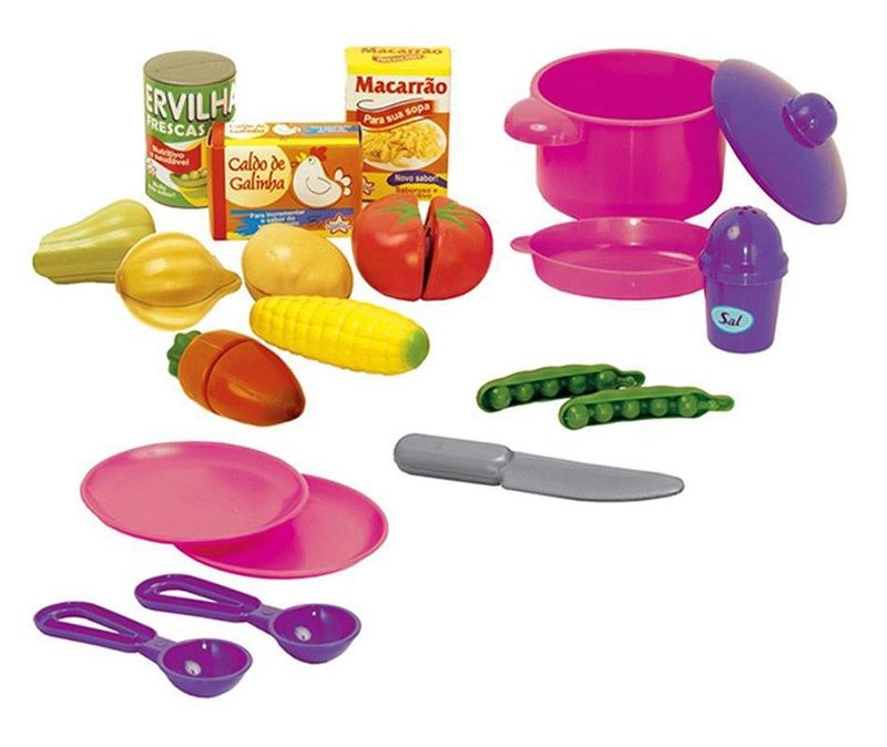 Brincadeira que tem comidinha de brinquedo, e mesmo uma delicia, com este kit voce vai fazer uma sopinha super saborosa de faz de conta que dara ate agua na boca, as pecas possuem um sistema de velcro que permite que os legumes possam ser cortadas ao meio, depois e so prender o velcro novamente e recomecar a brincadeira. Brincar de faz de conta proporciona uma vivencia do cotidiano que trabalha de forma divertida bons habitos alimentares, alem de outros inumeros valores de vida saudavel.