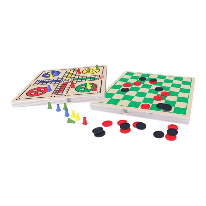 O clássico jogo de Dama e Ludo, é composto por 1 caixa estampada em serigrafia de um lado com o jogo de Ludo e do outro lado com o jogo de Dama, 40 peças e 1 dado. Além disso o tabuleiro possui uma abertura na lateral para guardar todas as peças. Feito em madeira e plástico, este jogo educativo trabalha a recreação, trabalho em grupo, cooperativismo e memória, e é indicado para crianças a partir de 7 anos de idade. Quando se pensa em jogos de tabuleiro, é comum que as pessoas os associem a atividades recreativas. De fato, eles servem para entreter e divertir os praticantes, mas também os estimulam a raciocinarem, a criarem estratégias e a focarem no objetivo de vencer o adversário. Além, disso, esses brinquedos didáticos instigam a dimensão interpessoal, fazendo com que um participante trabalhe em regime de cooperação com outros.