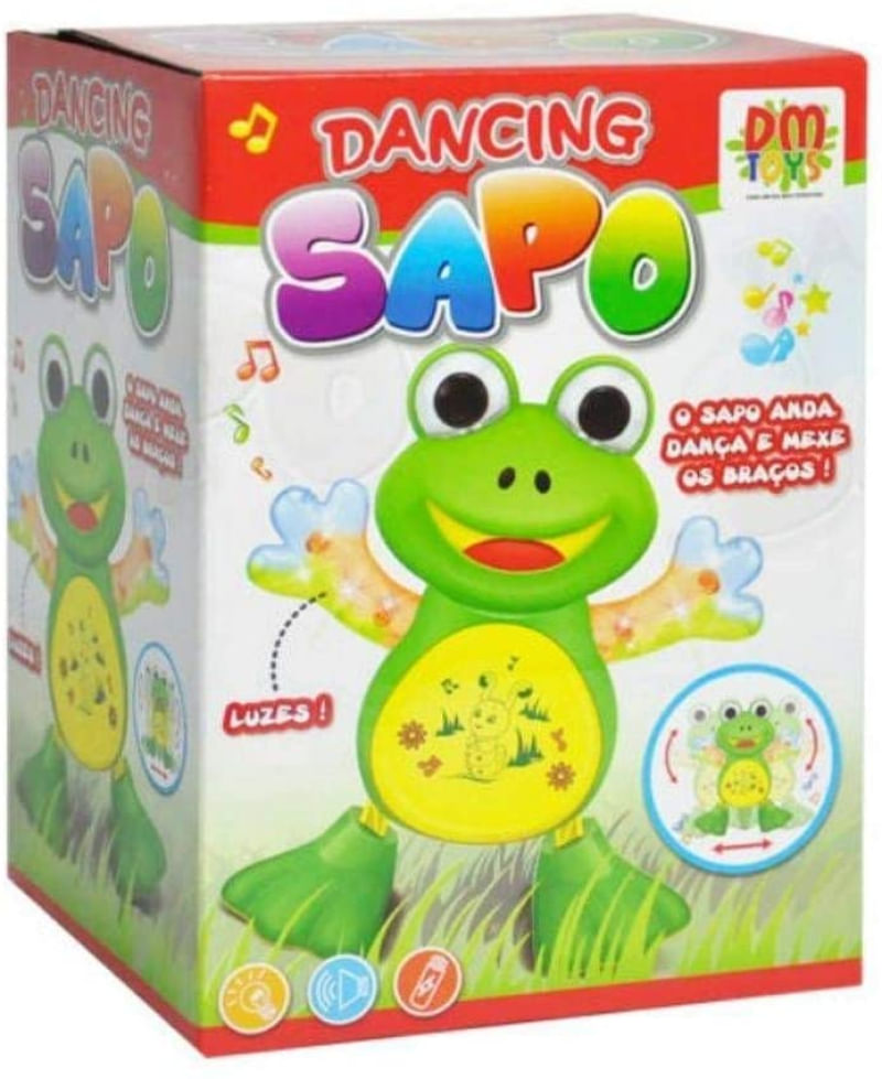 Dancing Sapo é o brinquedo musical que anda, dança e mexe seus braços, emite sons e Luzes. Este sapinho musical traz alegria e diversão nas brincadeiras, para todas as crianças...