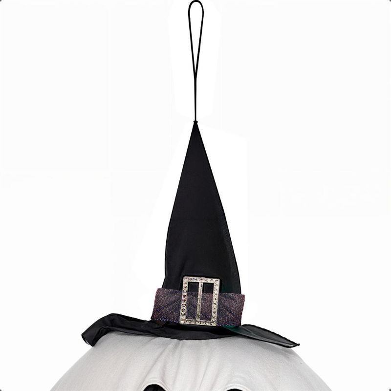 Fantasma de pendurar com luzes de LED. Luzes em 3 modos de brilho colorido. Feito de poliéster leve e resistente. Inclui chapéu decorativo. Ideal para varandas e locais cobertos.