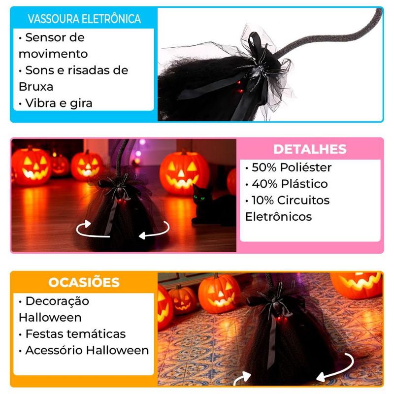 Entre no clima do Halloween com a vassoura de halloween com sensor de movimento! Um acessório divertido e assustador que ativa sons de bruxa, risadas e vibrações sempre que alguém se aproxima. Além de emitir efeitos sonoros, a vassoura gira e cria uma atmosfera única para festas temáticas, decorações e brincadeiras. Com design leve e funcionamento prático, é ideal para complementar a decoração de Halloween, surpreender convidados ou até mesmo como parte de uma fantasia criativa. Uma peça indispensável para quem busca um toque de terror e diversão em qualquer ambiente. Destaques do produto: Vassoura eletrônica com sensor de movimento Sons e risadas de bruxa realistas Vibra e gira automaticamente Funciona como acessório de decoração ou fantasia Ideal para festas, Halloween e eventos temáticos