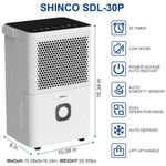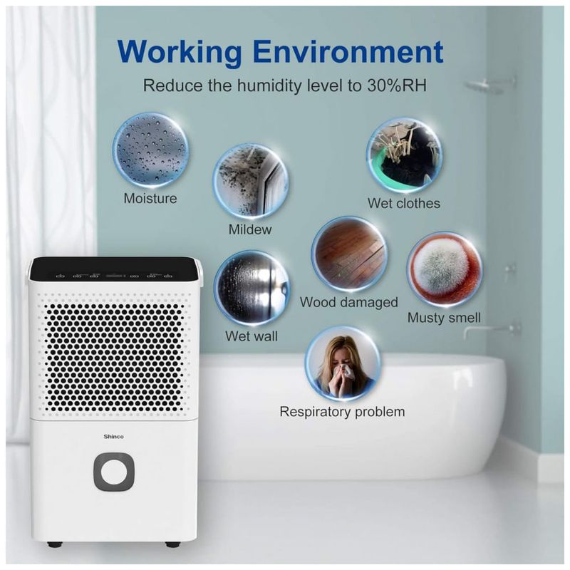 MORDERN DESIGN E SILENCIOSO Desumidificador Shinco projetado com aparência elegante e moderna. O display LED mostra visualmente os níveis de umidade e a duração do temporizador, a alça de elevação ergonômica é fácil de mover para cima e para baixo. 2 velocidades de ventilador ajustáveis para várias escolhas, você pode definir uma velocidade de ventilador baixa que não irá incomodá lo quando estiver dormindo ou no trabalho. Som de pico de 42 dB para que você quase não perceba que está lá.