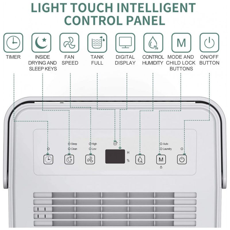 Design Humanizado Múltiplo O desumidificador de segurança possui 2 modos de desumidificação Lavanderia modo contínuo, Automático modo personalizado Rodas e alça universais embutidas, fáceis de mover Reinício automático e descongelamento automático O filtro de carvão ativado substituível torna o ar da sua casa mais limpo e fresco