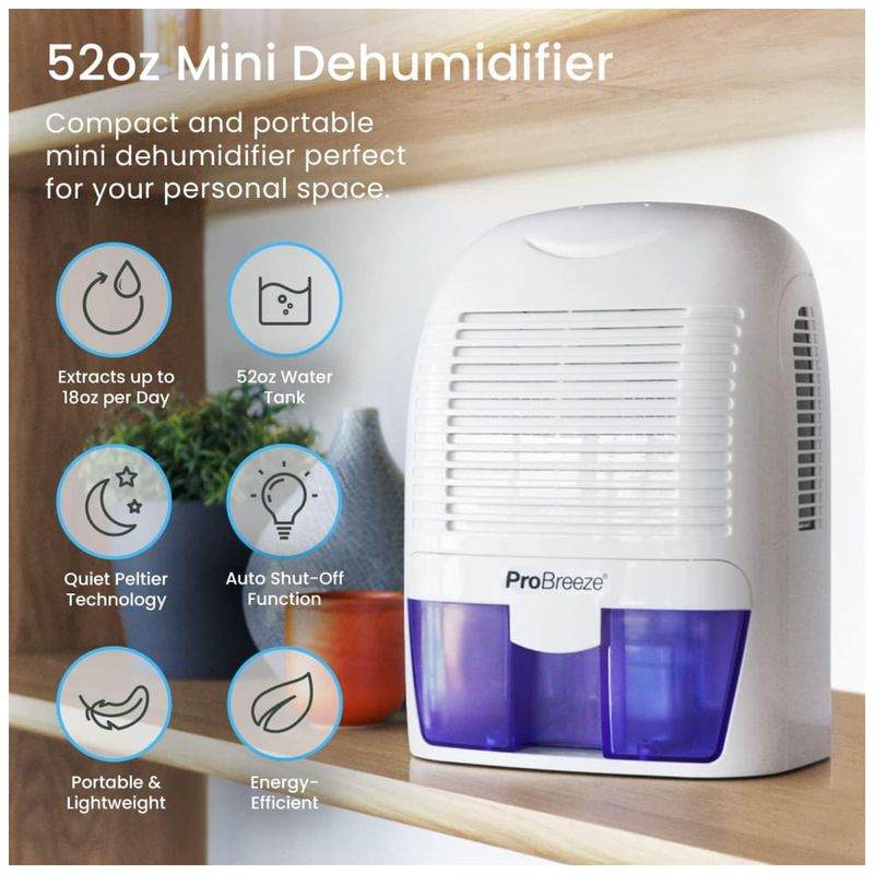 PEQUENO E COMPACTO Leve, compacto e portátil Ð Capaz de remover até 18 onças de água por dia com um tanque de 1500 ml de água. Ideal para salas de até 23m2 AUTO SHUT OFF Quando cheio, o desumidificador desliga se automaticamente e a luz LED acende indicando que o tanque de água precisa ser drenado. Basta esvaziar o tanque de água e colocá lo de volta no desumidificador ULTRA SILENCIOSO E EFICIENTE A Tecnologia de Resfriamento Termoelétrico Integrado Peltier opera sem um compressor, o que significa uma operação silenciosa em quartos, banheiros e escritórios REMOVE , 600ml POR DIA Função ideal em salas de até 23m2 BAIXA UMIDADE Perfeito para alta umidade em sua casa, cozinha, banheiro, quarto, trailer, garagem, armário. Como todos os mini desumidificadores, a temperatura operacional ideal é de 15 30C. Não funcionará abaixo de 5C.