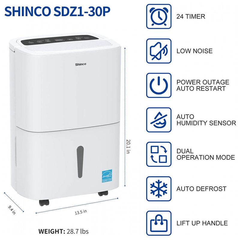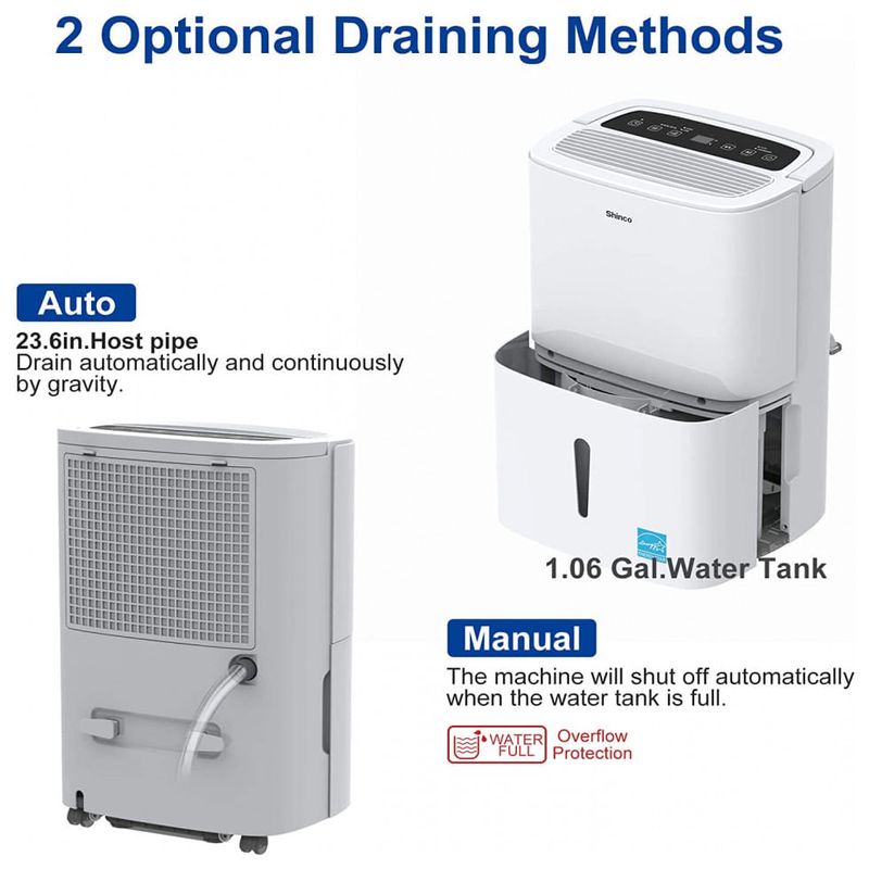 DESUMIDIFICADOR DE 464m2 Nosso desumidificador remove 70 pint 2012DOE, 27C, RH60 de água por dia e ajusta a umidade de 85 a 35, perfeito para uso em casa, porão, adega, garagem. Este é nosso modelo maior e mais capaz, ideal para salas grandes de até 464m2 e , ou espaços muito úmidos. Capacidade máxima de desumidificação 120L, 30C, RH90 SILENCIOSO E ECONOMIA DE ENERGIA Este desumidificador certificado pela Energy Star é adequado para absorver umidade de forma rápida e eficaz com consumo mínimo de energia em salas médias a grandes, sem acumular sua conta de energia. Os aparelhos Energy Star não são apenas melhores para o meio ambiente, mas também custam 30 menos para operar em comparação com aparelhos não Energy Star. Som de pico de 48 dB, de modo que você nem percebe que está lá. Em geral, 50 decibéis é provavelmente tão alto quanto uma conversa normal. FÁCIL DE USAR Ajuste para a configuração de desumidificação ideal, depois deixe funcionar seu ciclo contínuo de 24 horas até que o tanque esteja cheio, ele desligará automaticamente Capacidade do Tanque de Água 7L. Se você não tiver tempo, pode escolher o modo de drenagem contínua. A bomba interna remove automaticamente a água coletada do desumidificador para que você nunca tenha tempo de inatividade devido ao balde de água cheio. A água pode ser bombeada lateralmente ou verticalmente a até 3,6 metros de distância. GRANDE CONVENIÊNCIA Seque rapidamente a roupa com um botão. Se passar por uma queda de energia devido a uma tempestade, você não quer ter que reiniciar todos os seus aparelhos e dispositivos eletrônicos. Os desumidificadores Shinco voltarão ao conjunto anterior. A tela de LED mostra visualmente os níveis atuais de umidade da sala e a umidade desejada. Você pode alterar a velocidade do ventilador, definir um temporizador de sono de 2, 4 horas, degelo automático em ambiente de baixa temperatura. Reservatório de água removível e fácil de mover