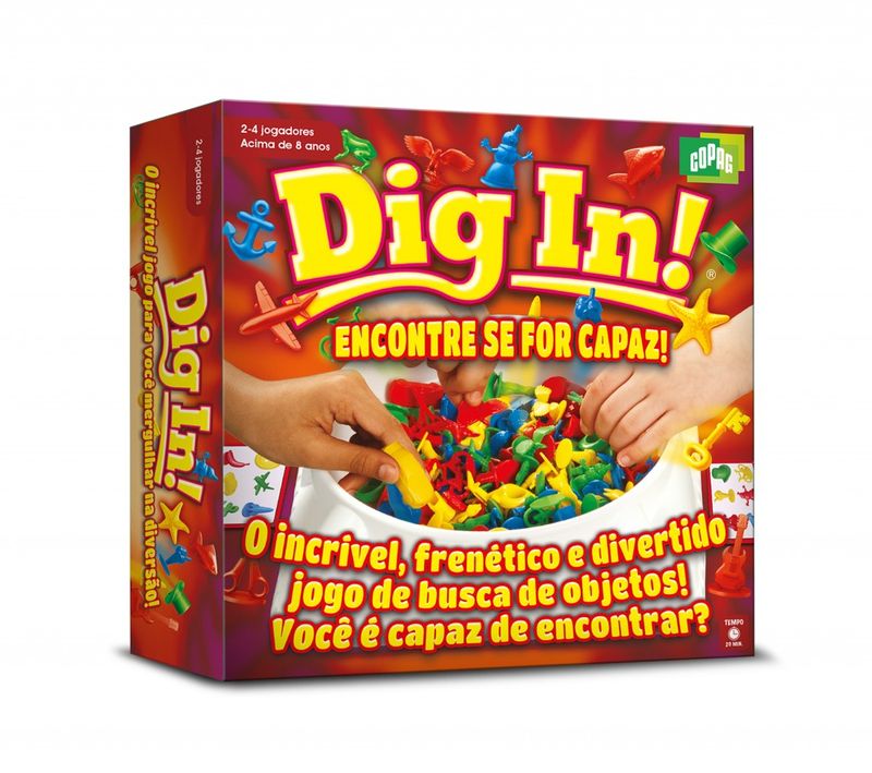 Dig In é um jogo para quem tem olhos de águia e dedos ágeis! Você vai correr contra o tempo e contra seus oponentes para encontrar e resgatar os 06 objetos que estão em sua carta.