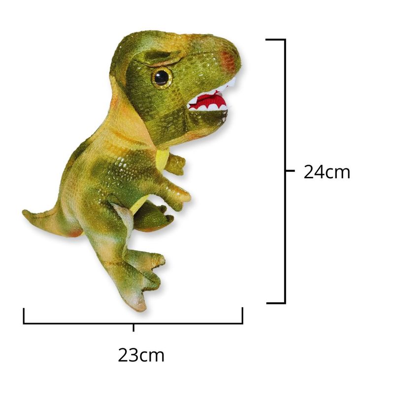 Ficha TécnicaProduto: Dinossauro Tiranossauro Rex de PelúciaMarca: Fizzy ToysAltura aproximada: 24 cmComprimento aproximado: 23 cmMaterial externo: Tecido macio texturizado antialérgicoEnchimento: Fibra sintéticaCores: Verde com detalhes em marrom, amarelo e vermelhoOlhos: Aplicados com efeito brilhanteIndicação: InfantilConteúdo da embalagem: 1 dinossauro de pelúcia