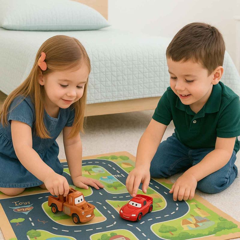O conjunto acompanha dois carrinhos super detalhados — Relâmpago McQueen e Mate — perfeitos para explorar cada curva do tapete. Feito com material emborrachado, macio e seguro, o tapete é confortável para brincar e fácil de limpar, garantindo diversão prática e duradoura.