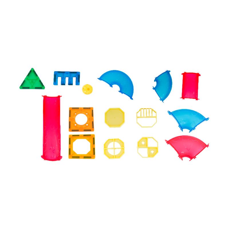 Contém: 27 Peças Magnéticas, 18 Peças de Encaixe, 16 Peças Para Montar Tubos, 02 Peças Para Rampa, 04 Bolas. Acompanha Cartela de Adesivos.