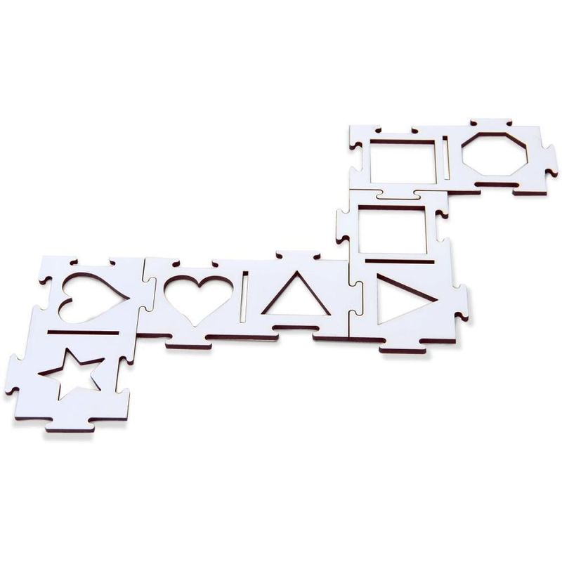 Jogo que auxilia no raciocinio, na percepcao tatil e visual. Descritivo detalhado: Confeccionado em M.D.F. com 28 pecas que se encaixam entre si, com figuras geometricas vazadas que se associam a outras pecas.
