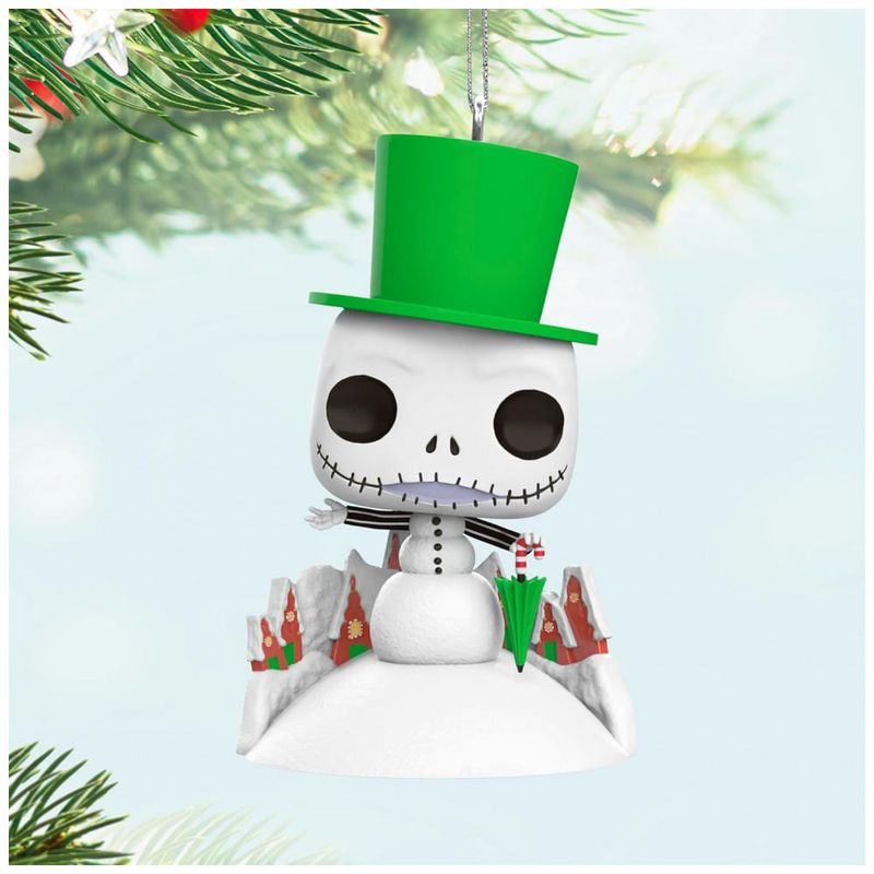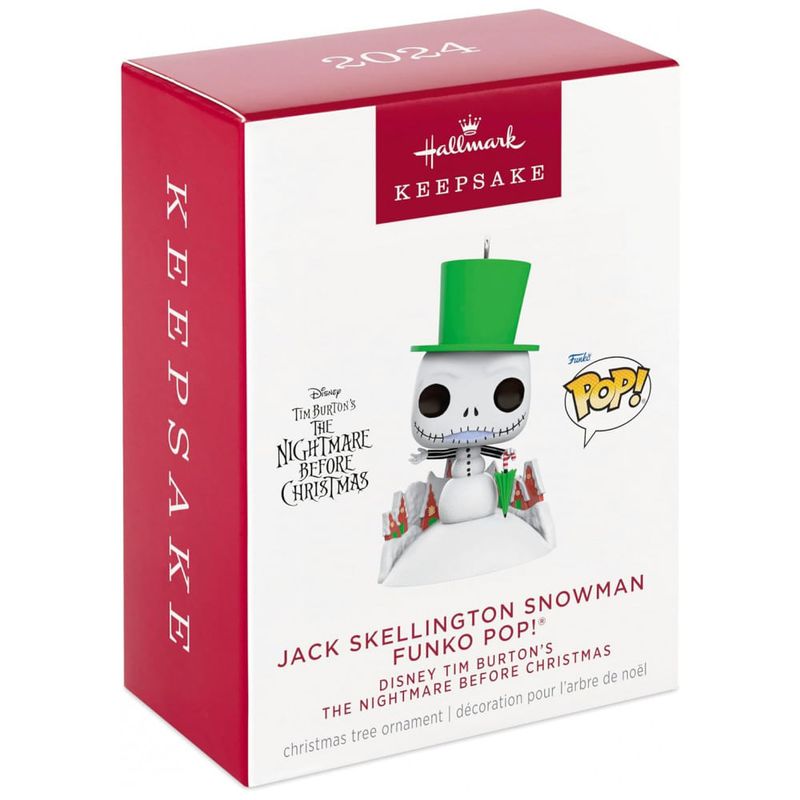 Enfeite de Natal Hallmark Keepsake 2024 com o personagem Jack Skellington como boneco de neve na Vila do Natal, inspirado no filme "O Estranho Mundo de Jack" de Tim Burton. Com design exclusivo Funko POP!, este enfeite em plástico traz detalhes marcantes e cor vibrante, perfeito para fãs da Disney e colecionadores. Acompanha gancho para pendurar e caixa para presente, garantindo proteção e facilidade no armazenamento.