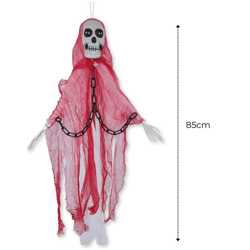Transforme sua festa de Halloween em um cenário de arrepiar com este incrível enfeite de caveira acorrentada! Com 85 cm de comprimento, esse adorno assustador é perfeito para criar uma atmosfera sombria e aterrorizante. Ele vem com um sensor de presença que ativa um som horripilante de risada e luzes piscantes nos olhos, garantindo sustos e diversão a cada movimento perto dele.